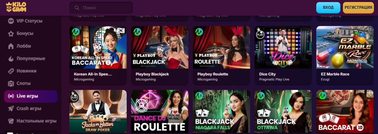 В онлайн казино Kilogram пользователи не смогут запускать в бесплатном режиме игры с живыми дилерами. Они предназначены, только для запуска на реальные деньги. В них функция “Демо” будет отсутствовать.