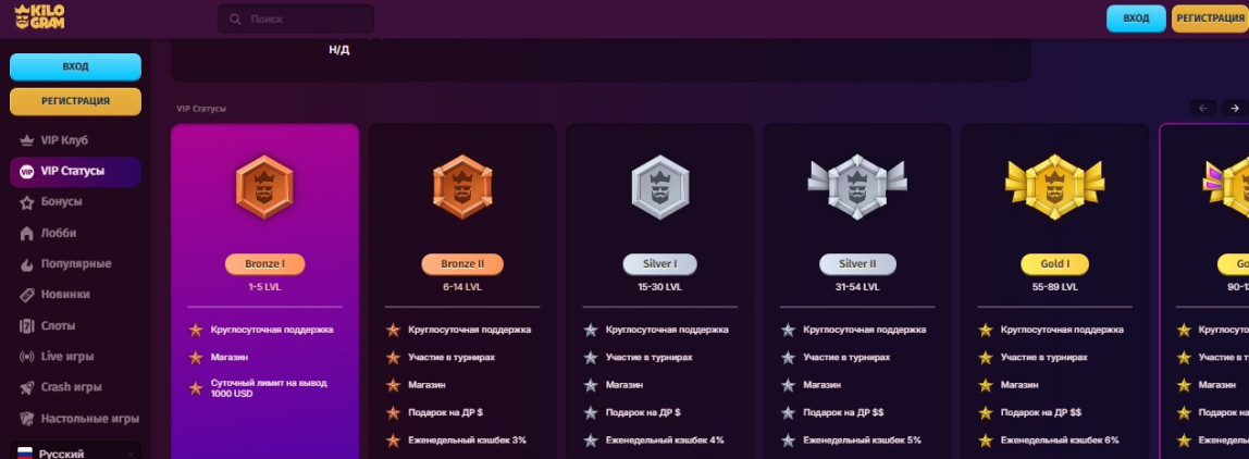 На азартной платформе Kilogram доступна программа лояльности. Она автоматически поощряет игроков за их активность в онлайн казино, и дарит им различные вознаграждения. Всего доступно 8 уровней, каждый из которых обладает уникальными поощрениями. Главное преимущество такой программы - автоматическое подключение. Как только игрок зарегистрировался в онлайн казино, к аккаунту моментально подключилась специальная программа, которая учитывает всю активность пользователя, и его ежемесячно награждает подарками.